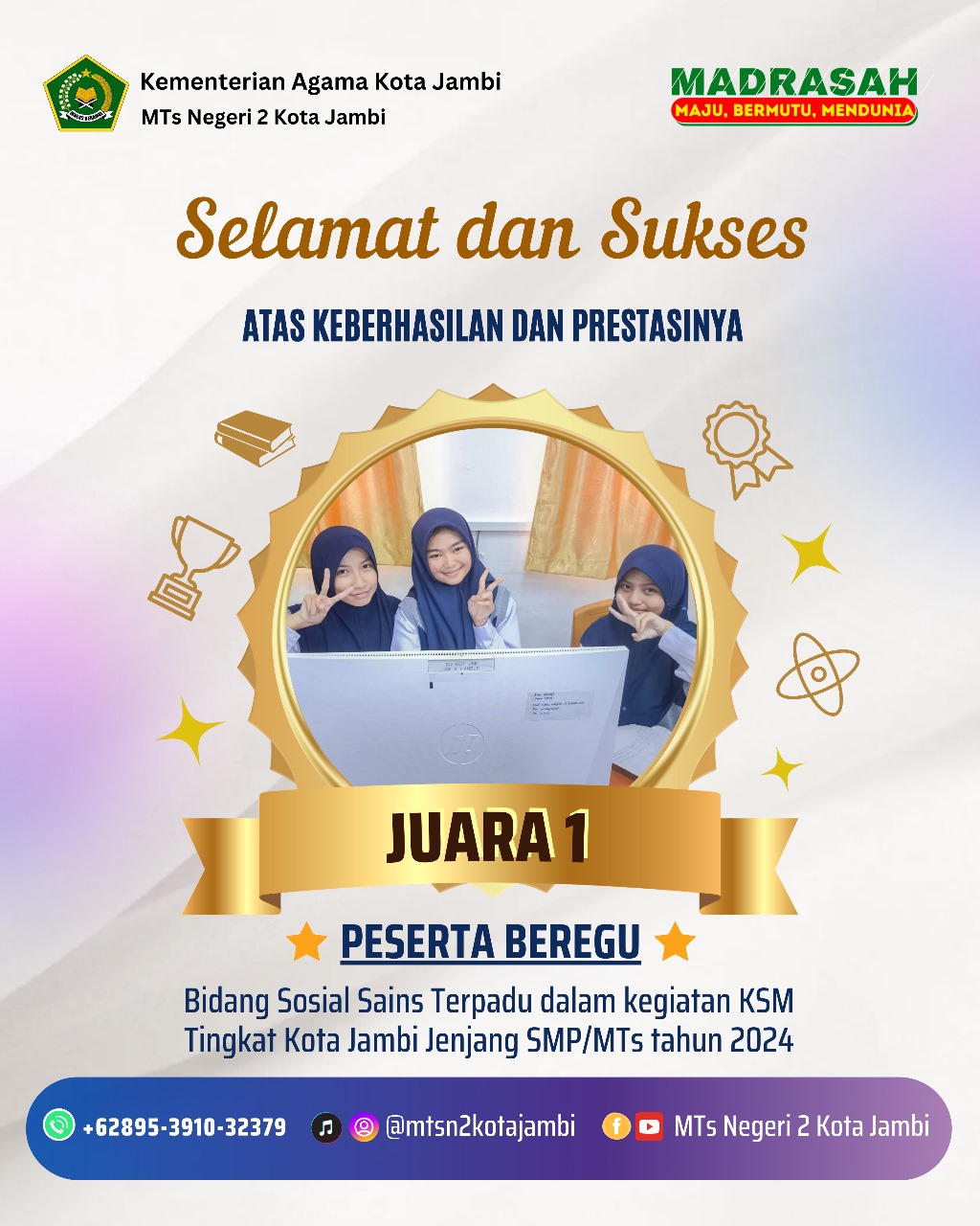 Siswa Madrasah Tsanawiyah Negeri 2 Kota Jambi yang mengikuti bidang Beregu Sosial Sains Terpadu adalah Nabilah Khansa Callista (IPS) kelas 8j, Aulya Febri Olivia (IPA) kelas 8k, Chiara Khairina (Matematika) kelas 8k.