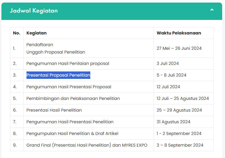 Seusia dengan jadwal kegiatan Myres 2024 bahwa tanggal 5—8 Juli adalah pelaksanaan Presentasi Proposal Penelitian bagi peserta Myres 2024 yang telah lulus seleksi.