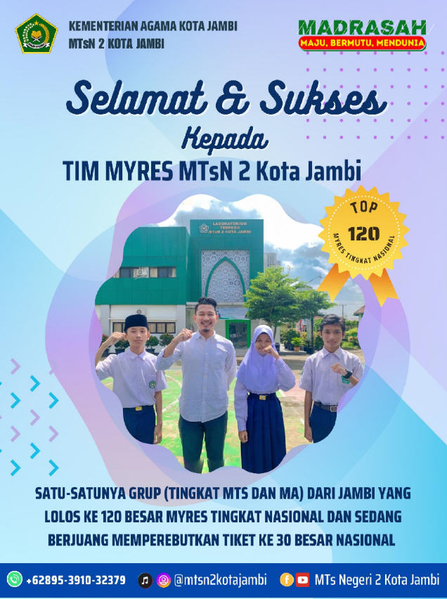 Tim dari Madrasah Tsanawiyah Negeri (MTsN) 2 Kota Jambi, pada hari Ahad, 7 Juli melakukan Presentasi Proposal Penelitian. Tim MTsN 2 Kota Jambi atas nama Akram Ziyad Usman (kelas VIII), Nailatul Azizah (kelas VII) dan Muhammad Alfarizi (kelas VII). Mereka mengambil penelitian dibidang Ilmu Sosial dan Humaniora, dengan judul Deposit Slot : Pengaruh Mental Health Generasi Z di Kota Jambi dalam Pemenuhan Kebutuhan Hidup.