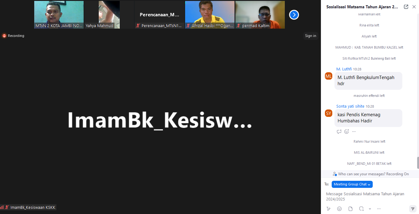 Bertempat di dalam jaringan, hari jumat, tanggal 12 Juli 2024 di mulai pukul 09.00 Wib s.d 11.00 Wib. Kegiatan ini dibuka langsung oleh Direktur KSKK Madrasah bapak Dr. H.M Sidik Sisdiyanto. Madrasah Tsanawiyah Negeri (MTsN) 2 Kota Jambi di wakili oleh Ketua Panitia Matsama, Nofriadi,S.Pd. mengatakan bahwa bapak direktur KSKK menghimbau untuk jangan sampai ada perpeloncoan di dalam kegiatan MATSAMA di dalam Madrasah. Dan di dalam kegiatan sosialisasi pelaksanaan masa taaruf siswa madrasah (MATSAMA) untuk penjelasan juknis MATSAMA 2024 langsung di sampaikan Kasubdit Kesiswaan bapak Dr. Imam Bukhori, S.Pd, M.Pd. disini Kasubdit kesiswaan menyampaikan tujuan kegiatan MATSAMA dilakukan yaitu :