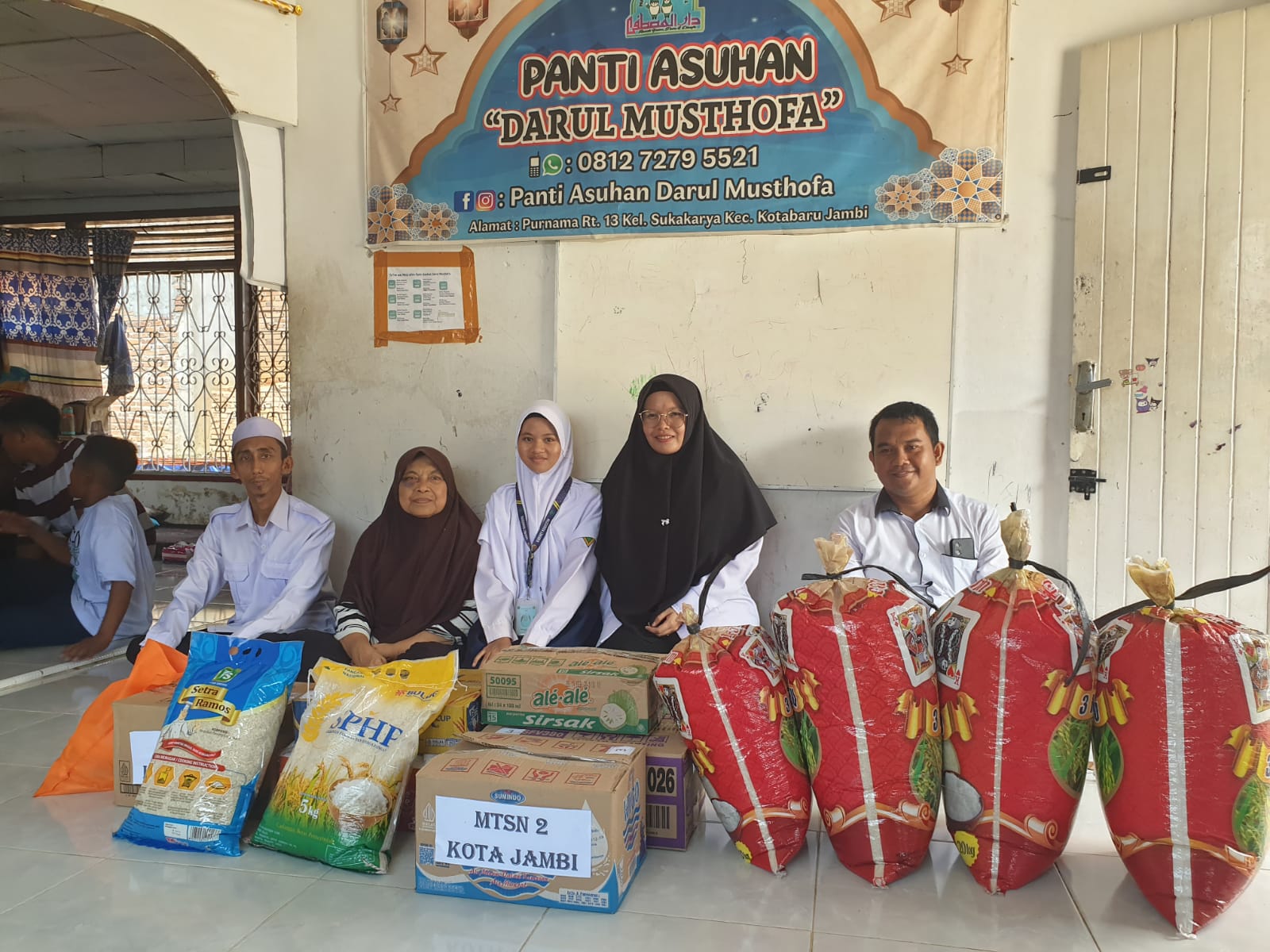 Bantuan sembako yang bersumber dari Siswa-Siswi, guru dan staf MTSN 2 Kota Jambi ini, diserahkan kepada panti Asuhan Teratai dengan jumlah warga 42 anak, Panti Asuhan Al Mahri 25 anak, dan Panti Asuhan Darul Musthofa 25 anak. Bantuan yang di salurkan berupa gula, beras, Minyak Sayur, Sabun, Teh dan lain-lain.