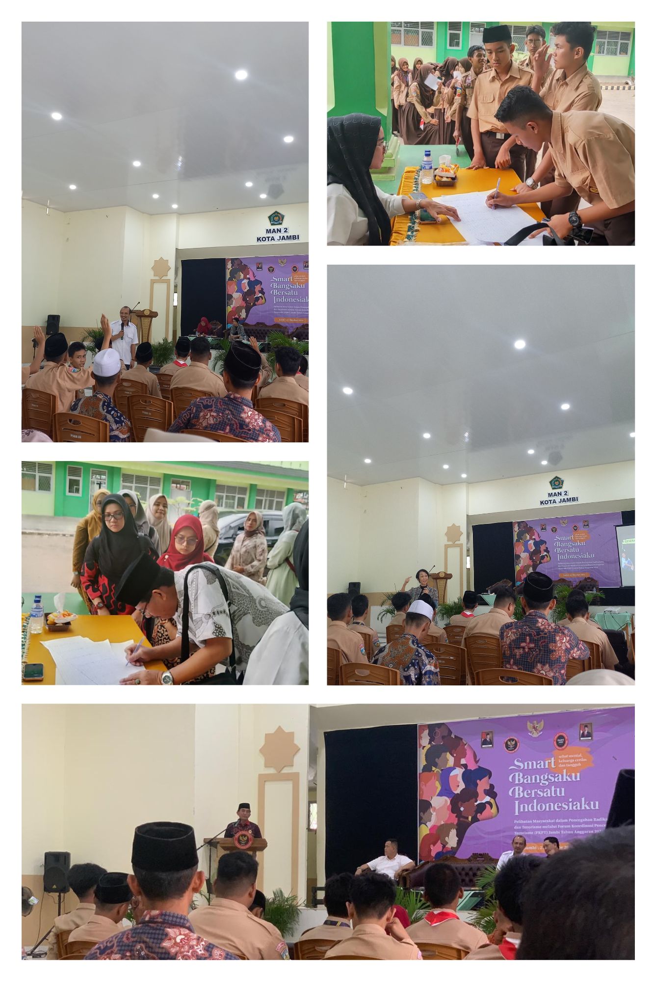 Forum oordinasi Pencegahan Terorisme (FKPT) Provinsi Jambi pada hari Rabu, 23 Oktober 2024 di Aula MAN 2 Kota Jambi mengadakan seminar Sehat Mental Keluarga Cerdas dan Tangguh dalam Pencegahan Radikalisme dan Terorisme yang diikuti oleh Siswa MTsN 2 Kota Jambi. Kegiatan seminar untuk memberikan kesadaran dini kepada peserta akan bahaya laten Radikalisme dan Terorisme dengan membentuk kesadaran yang cerdas dan Tangguh dalam sebuah komunitas keluarga. Peserta 60 orang yang terdiri dari 40 siswa, 10 orang tua siswa, 10 guru tenaga pendidik dan kependidikan.
