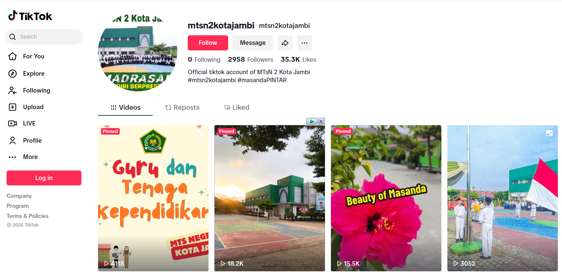 Kota Jambi (MTsN 2) – MTsN 2 Kota Jambi terus menunjukkan perkembangan pesat dalam membangun kekuatan digitalnya. Dengan akun Instagram yang kini memiliki 7.697 followers dan telah menghasilkan 748 posts, serta akun TikTok yang meraih 2.958 followers, madrasah ini telah berhasil memanfaatkan media sosial untuk memperkenalkan berbagai kegiatan dan prestasi kepada masyarakat.