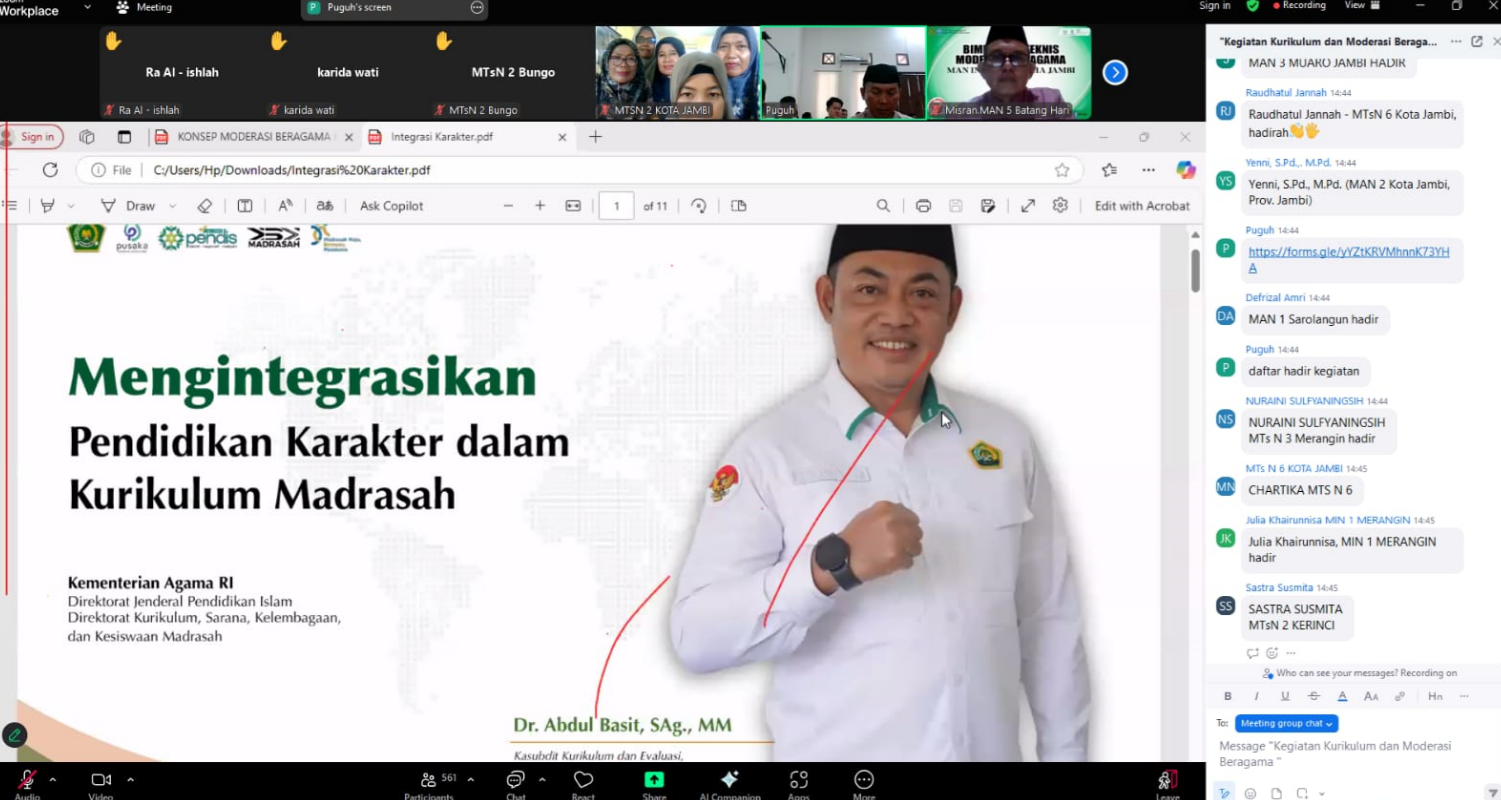 Kota Jambi (MTsN 2) – MTsN 2 Kota Jambi turut ambil bagian dalam kegiatan nasional bertajuk `Kurikulum dan Moderasi Beragama`, yang diselenggarakan secara daring melalui Zoom Meeting pada Jumat, 17 Januari 2025. Acara ini dimulai pukul 14.00 WIB dan melibatkan kepala madrasah, guru, serta peserta didik dari Madrasah-madrasah di provinsi Jambi dan dibuka langsung oleh Kepala Kanwil Kementerian Agama Provinsi Jambi, Dr. H. Mahbub Daryanto, M.Pd.I.