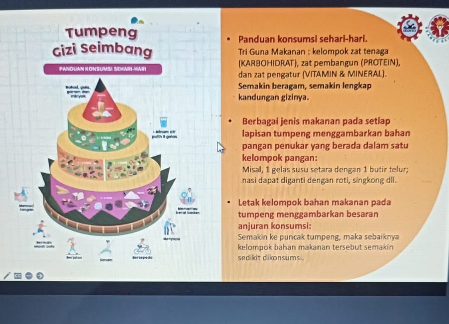 Narasumber menjelaskan bahwa untuk memenuhi kebutuhan zat gizi, remaja dianjurkan mengonsumsi makanan yang beragam dan mengikuti Pedoman Gizi Seimbang (PGS) yang diwakili oleh simbol Tumpeng Gizi Seimbang. Pedoman ini terdiri dari empat pilar utama: