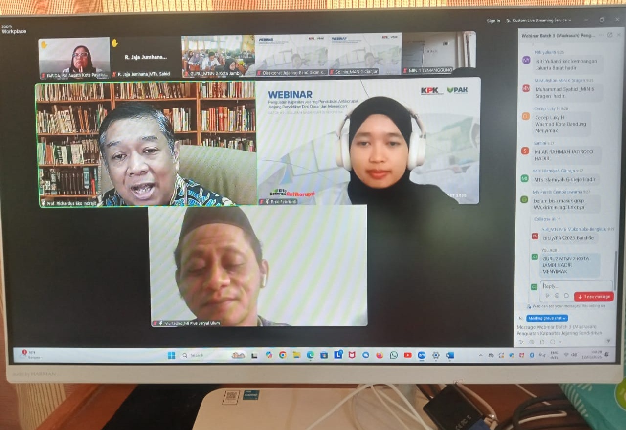 Kota Jambi (MTsN 2) - Guru MTsN 2 Kota Jambi turut serta dalam Webinar Penguatan Kapasitas Jejaring Pendidikan Antikorupsi untuk jenjang Pendidikan Anak Usia Dini, Dasar, dan Menengah yang diselenggarakan oleh Komisi Pemberantasan Korupsi (KPK) RI. Kegiatan ini berlangsung melalui Zoom dan Live Streaming YouTube KPK RI pada Rabu (12/2/2025) pukul 08.00 WIB.