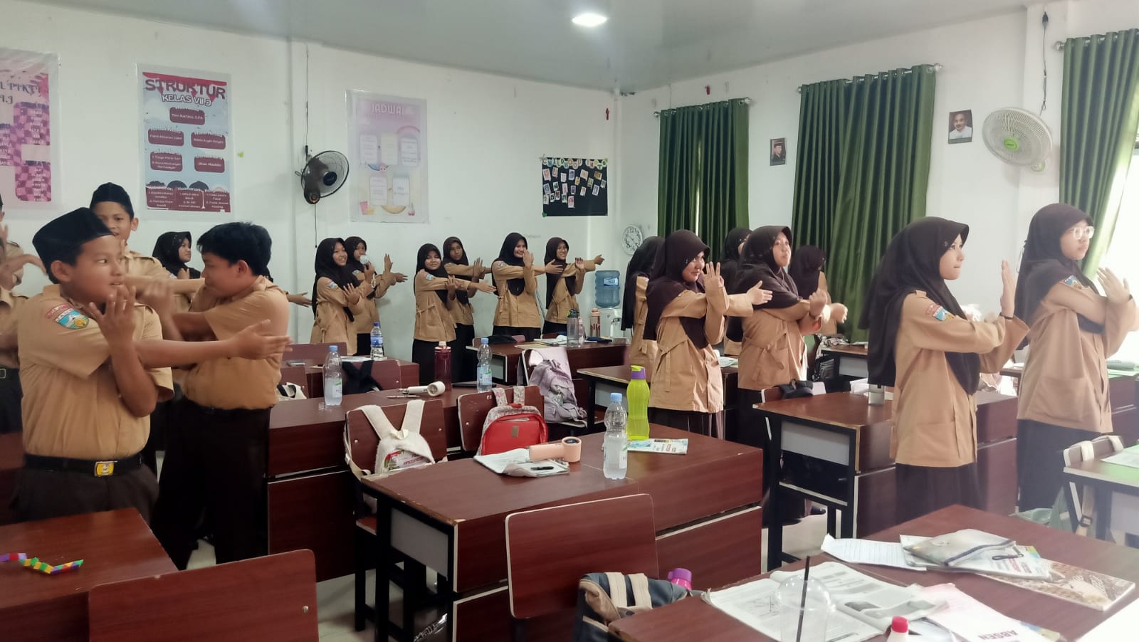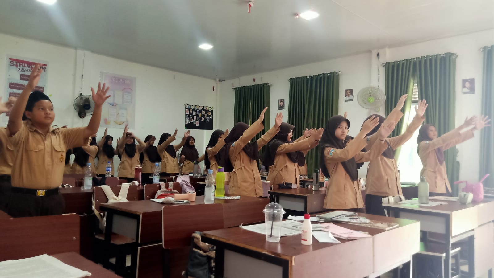Meskipun dilakukan di dalam kelas, semangat siswa tak kalah seru. Dengan iringan musik ceria dan gerakan yang disesuaikan dengan ruang terbatas, para siswa tampak antusias melakukan gerakansenam.