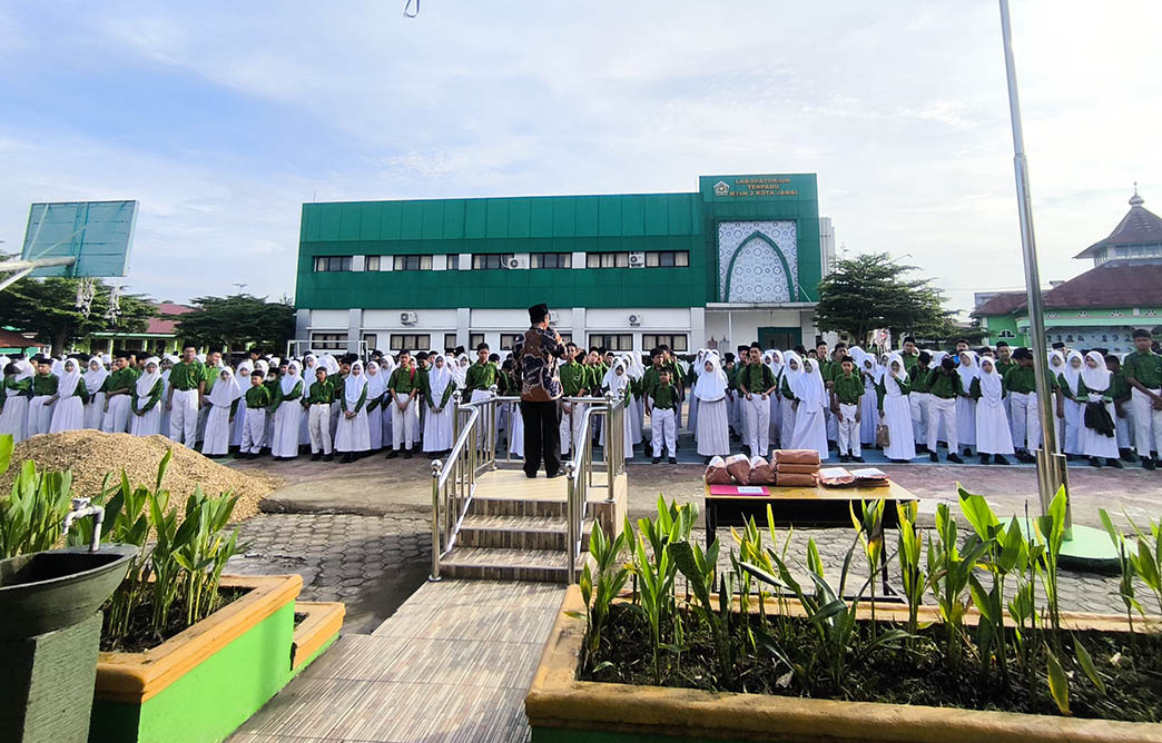 Kota Jambi (MTsN 2) - Menjelang masa liburan akhir tahun pelajaran, Plt Kepala Madrasah MTsN 2 Kota Jambi yang juga menjabat sebagai Wakil Kepala Bidang Kurikulum, Azikri, M.Pd, memberikan arahan khusus kepada seluruh siswa pada Kamis pagi (19/6/2025).