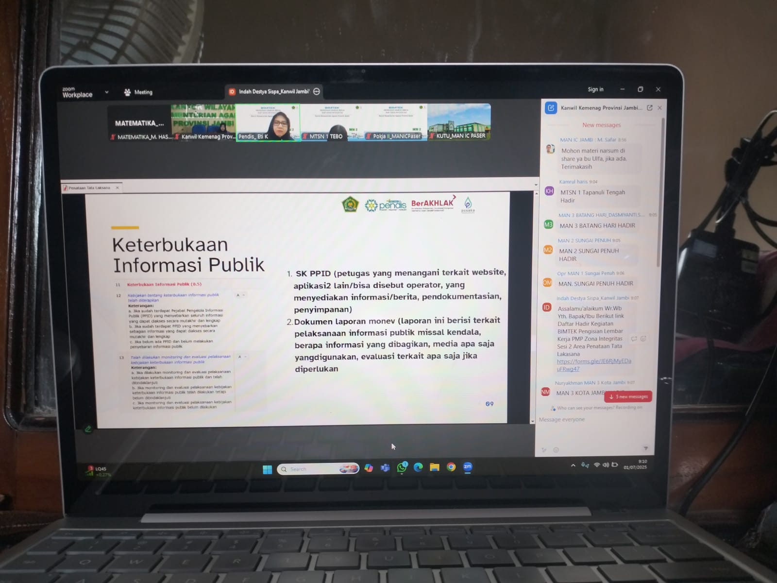 Kota Jambi (MTsN 2) - Tim Zona Integritas (ZI) MTsN 2 Kota Jambi kembali menunjukkan komitmennya dalam mewujudkan tata kelola madrasah yang bersih dan melayani dengan mengikuti Shortcourse Daring Pengisian Lembar Kerja PMP Zona Integritas Sesi 2 pada Selasa, 1 Juli 2025 pukul 08.30 WIB. Kegiatan ini difokuskan pada Area 2: Penataan Tata Laksana, dan menghadirkan narasumber Eti Kusumawati, S.S., Arsiparis Ahli Muda dari Ditjen Pendidikan Islam Kemenag RI.