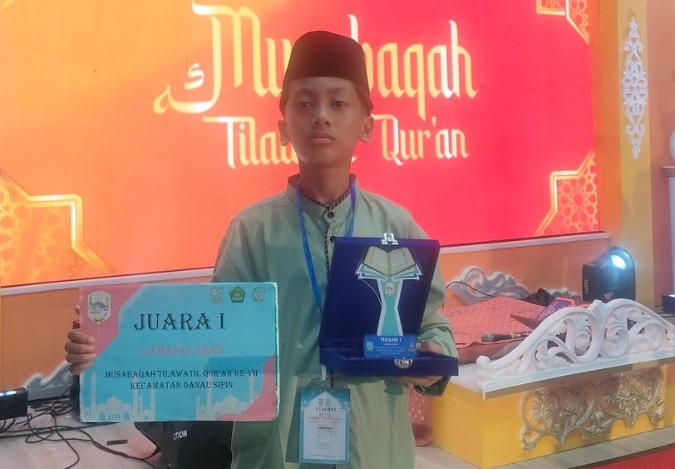 Kota Jambi (MTsN 2) - Kabar membanggakan gembira datang dari Athariz Azka Sitompul, siswa kelas 8H MTsN 2 Kota Jambi, berhasil meraih Juara 1 cabang lomba Adzan dalam ajang MTQ Tingkat Kecamatan Danau Sipin yang diselenggarakan pada 15 Juli 2025 di Masjid Baiturrahim, Kelurahan Selamat, sebagai tuan rumah acara.