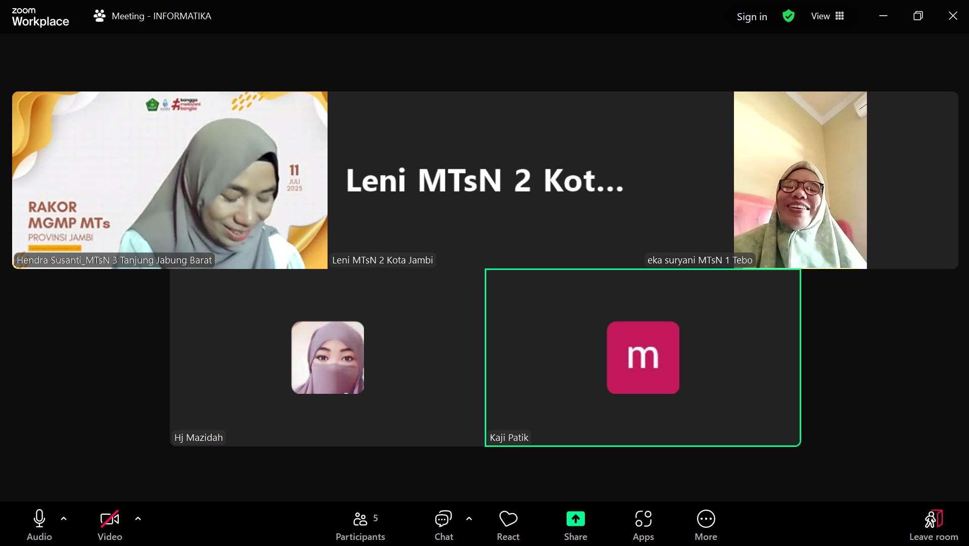 Kota Jambi (MTsN 2) - Guru MTsN 2 Kota Jambi turut berpartisipasi dalam Rapat Koordinasi (Rakor) Musyawarah Guru Mata Pelajaran (MGMP) Jenjang MTs Sesi 2 yang dilaksanakan secara daring melalui Zoom pada Jumat, 18 Juli 2025. Kegiatan ini berlangsung mulai pukul 13.30 hingga 15.00 WIB dan dipimpin oleh Ketua MGMP, Ibnatun Rif'ah, S.Si., M.Si.
