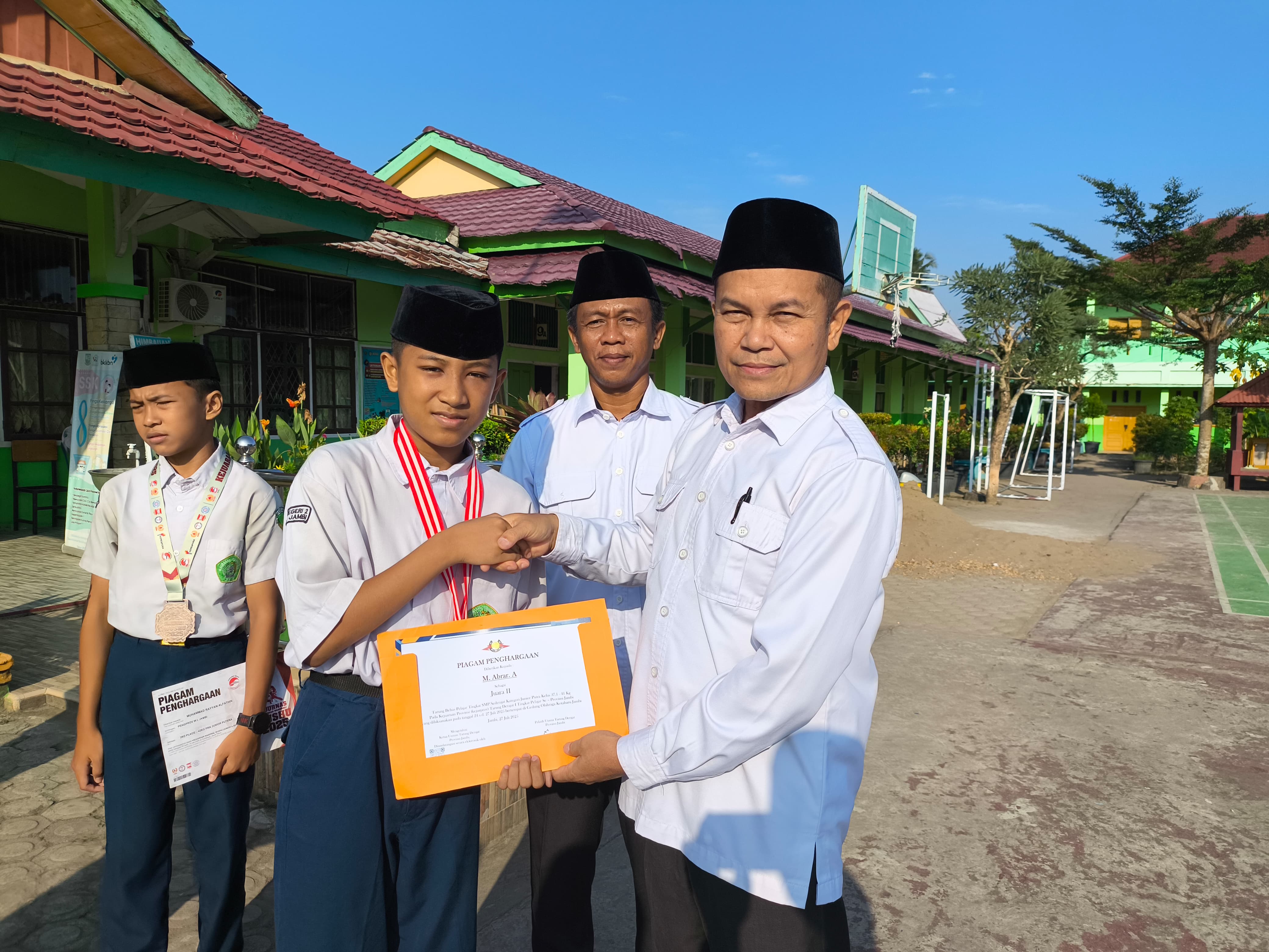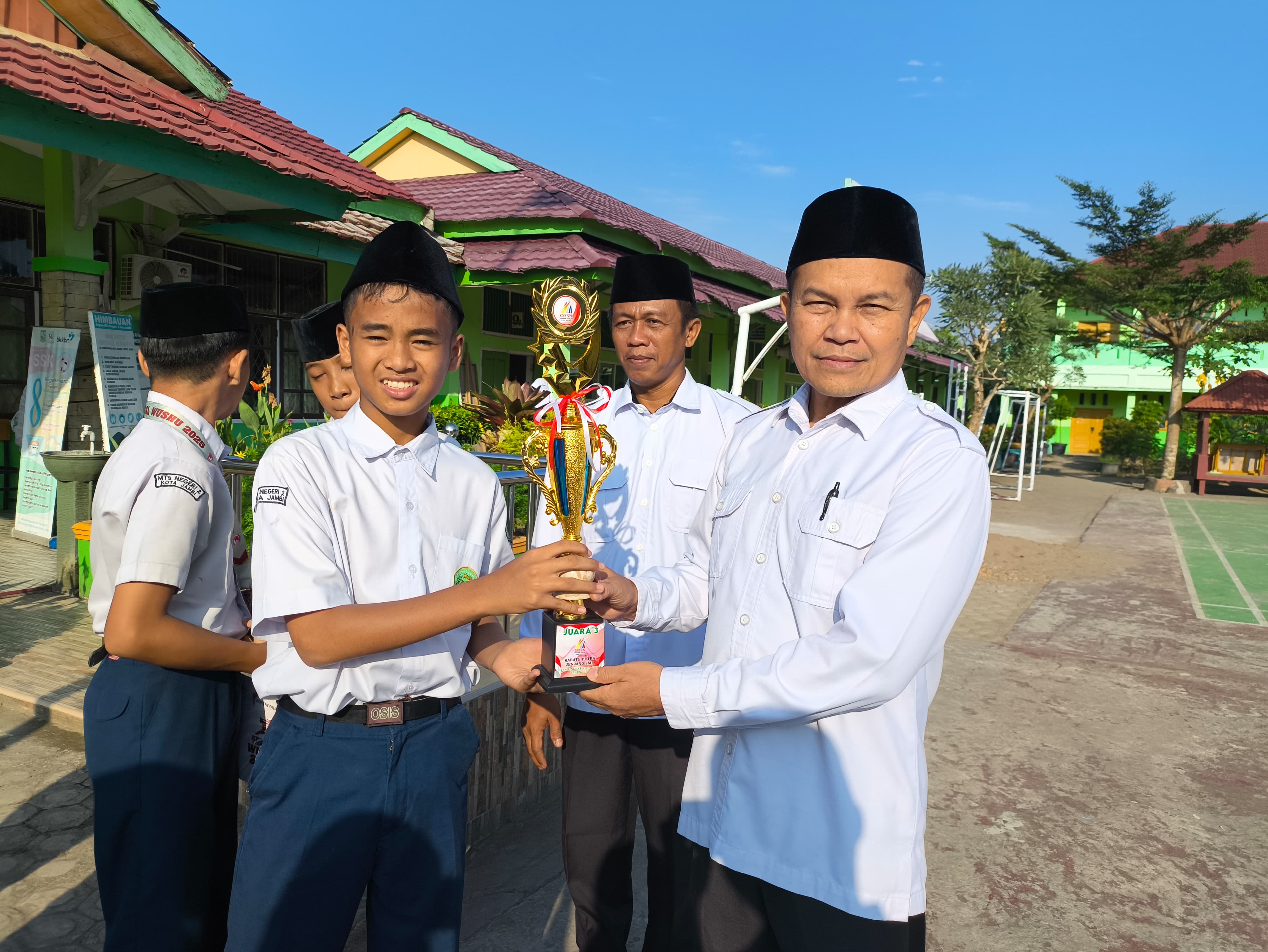 Kota Jambi (MTsN 2) — Usai pelaksanaan upacara bendera rutin, MTsN 2 Kota Jambi memberikan apresiasi simbolis kepada para siswa berprestasi yang telah mengharumkan nama madrasah di berbagai ajang. Kepala Madrasah, didampingi Wakil Kepala Bidang Kesiswaan, menyerahkan medali, piala, dan piagam penghargaan secara langsung di hadapan seluruh peserta upacara.