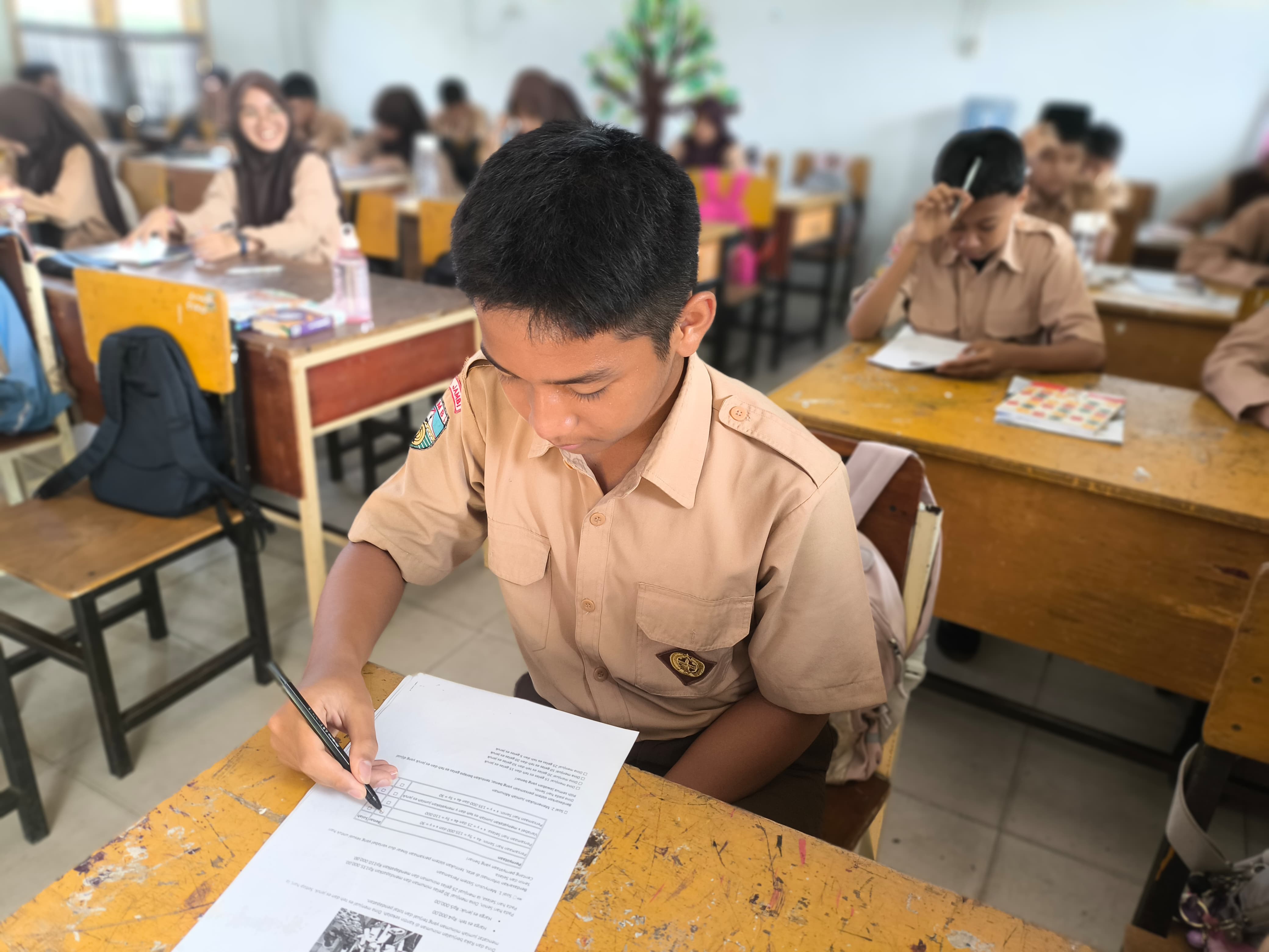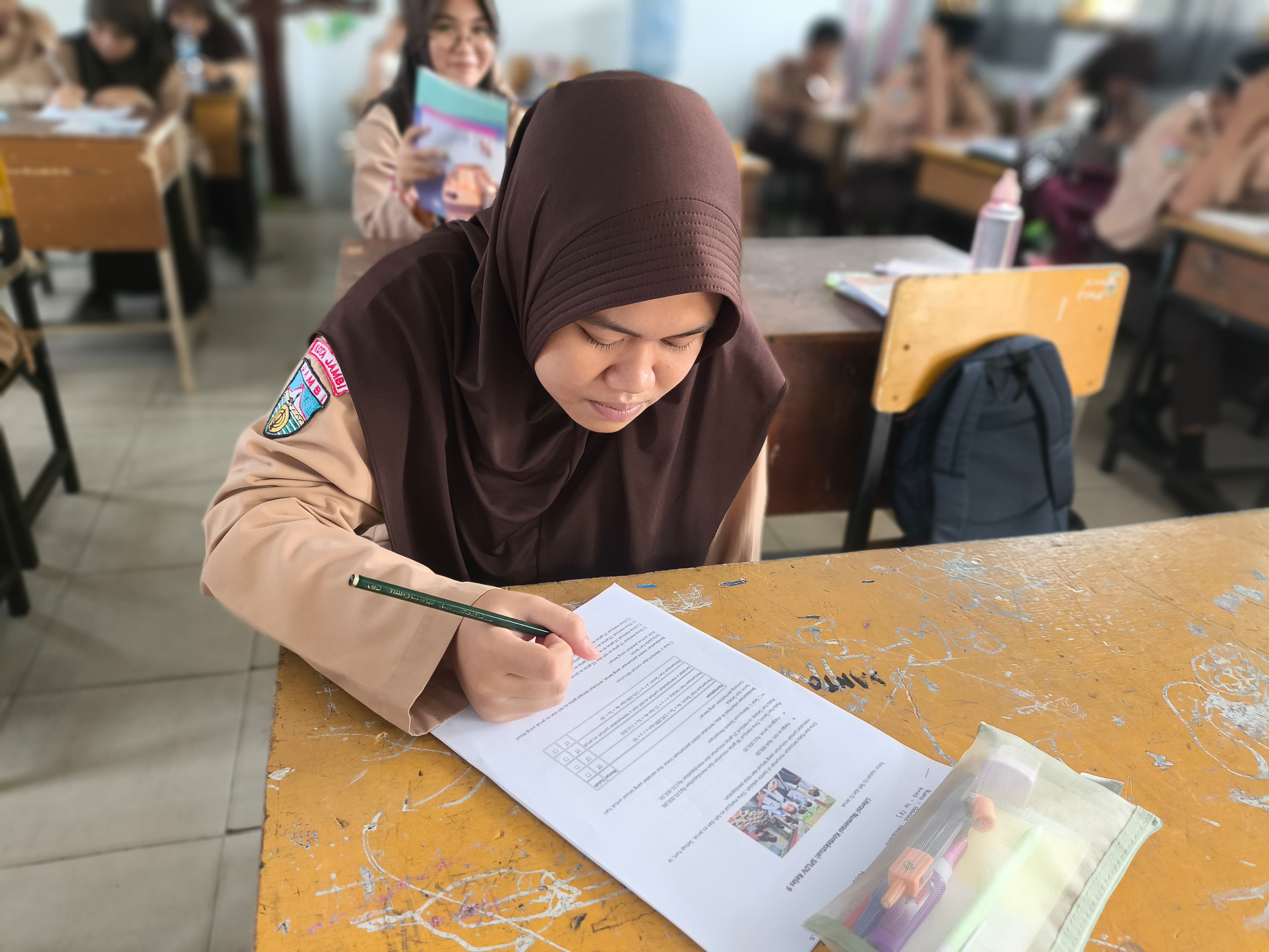 Siswa kelas 9F mengikuti asesmen dengan penuh konsentrasi dan semangat. Beberapa soal menampilkan konteks kehidupan sehari-hari seperti perbandingan harga, jumlah barang, dan pengeluaran, sehingga mendorong siswa untuk berpikir logis dan relevan.