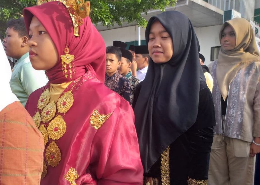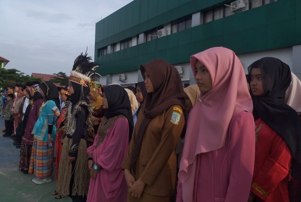 Pakaian adat yang dikenakan siswa mencerminkan kekayaan budaya busana tradisional. Perpaduan warna-warni kain, songket, batik, dan hiasan kepala membuat lapangan upacara tampak seperti mozaik keberagaman Indonesia yang sesungguhnya.