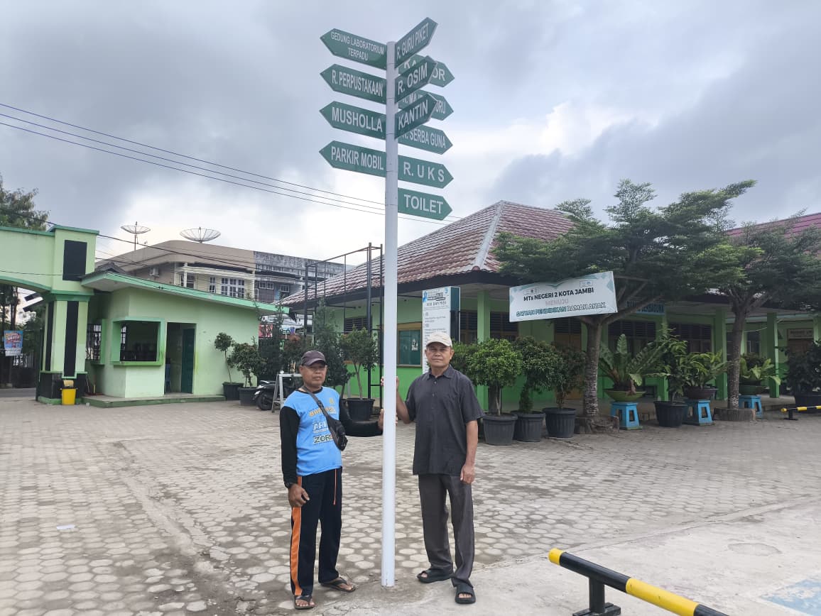 Tiang penunjuk arah yang dipasang di titik strategis sekitar lingkungan madrasah memudahkan masyarakat dan tamu untuk mengenali lokasi MTsN 2 Kota Jambi secara cepat dan jelas. Desainnya menyesuaikan dengan karakter visual madrasah yang informatif dan representatif.