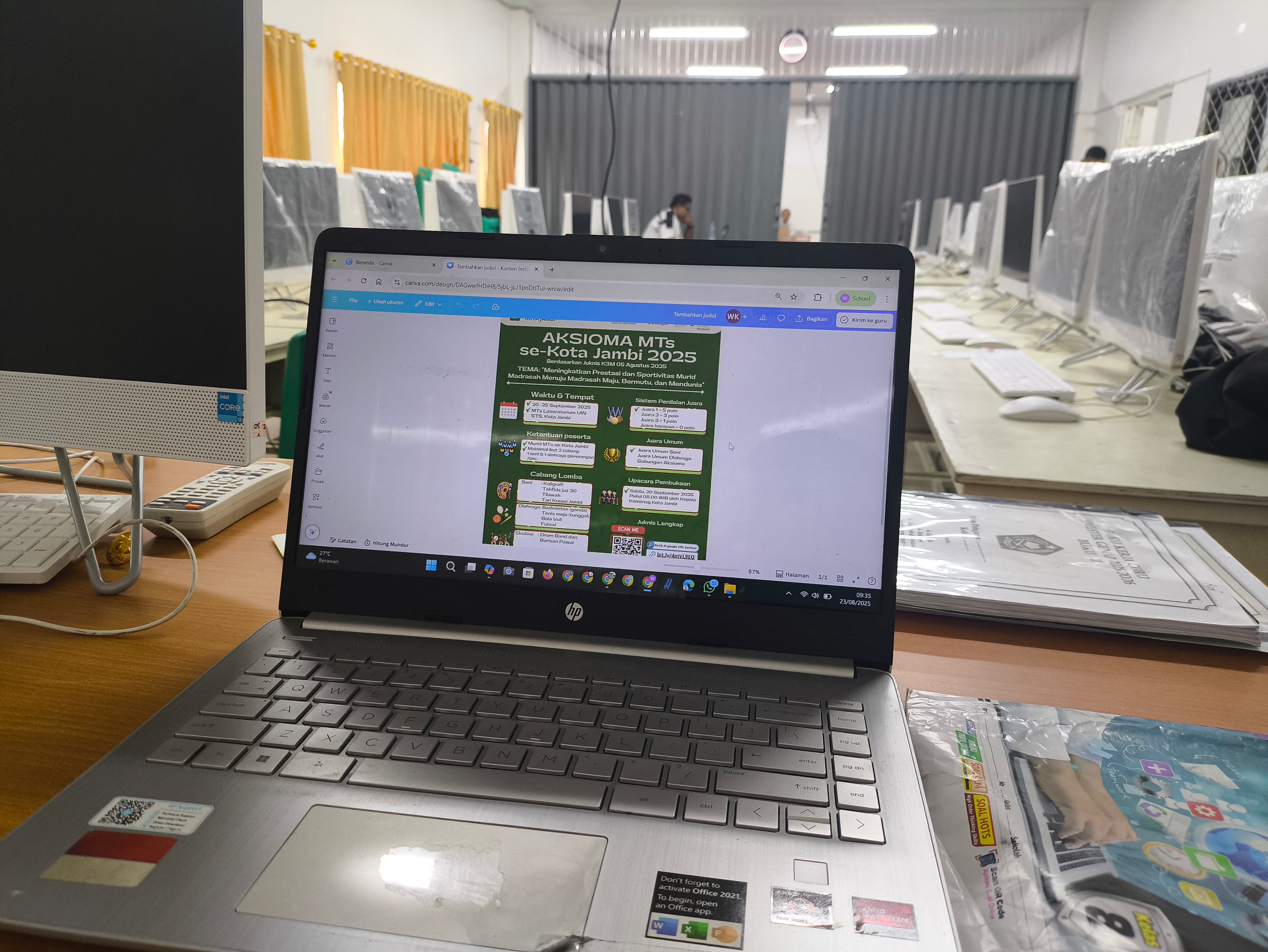 Kota Jambi, 23 Agustus 2025 — Di tengah kesibukan dokumentasi dan publikasi madrasah, Pak Wahid Kurniawan Suwarji, Wakil Kepala MTsN 2 Kota Jambi Bidang Humas, tetap menunjukkan komitmen luar biasa dalam mendukung program Kementerian Agama Kota Jambi. Hari ini, beliau lembur di madrasah sebagai bagian dari tim infografis Kemenag Kota Jambi, khusus untuk menyusun infografis kegiatan AKSIOMA yang sedang berlangsung.