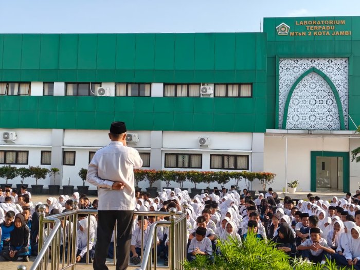 Kota Jambi, Selasa (26/08/2025) — Kepala Madrasah MTsN 2 Kota Jambi, Bapak Drs. H. Ahmad Syukri, memberikan arahan penting kepada seluruh warga madrasah terkait pelaksanaan program Makan Bergizi Gratis (MBG) yang kini menjadi bagian dari rutinitas harian siswa.
