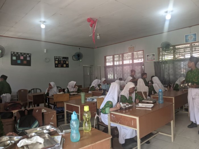 Kelas 8F MTsN 2 Kota Jambi memulai hari dengan semangat tinggi saat program Makan Bergizi Gratis (MBG) tiba di ruang kelas. Siswa langsung menata meja dan bersiap menyambut paket makanan bergizi yang telah disiapkan oleh tim madrasah.