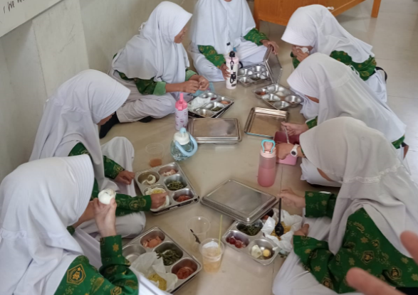 Wali kelas turut mendampingi kegiatan sambil menyampaikan pesan-pesan edukatif tentang pola makan sehat dan dampaknya terhadap konsentrasi belajar. Suasana hangat dan penuh kekeluargaan tercipta, memperkuat hubungan positif antara guru dan siswa serta membentuk karakter disiplin dan mandiri.