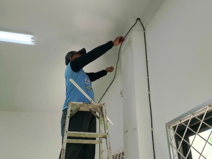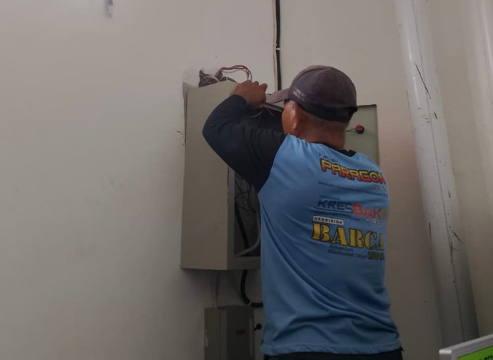 Pengecekan dilakukan secara menyeluruh pada titik-titik sambungan listrik, panel distribusi, dan jalur kabel yang terhubung ke perangkat komputer dan LCD proyektor. Pak Masrul menggunakan alat penguji tegangan untuk memastikan tidak ada arus bocor atau sambungan yang longgar. Setiap temuan langsung ditindaklanjuti dengan perbaikan dan penguatan koneksi kabel.