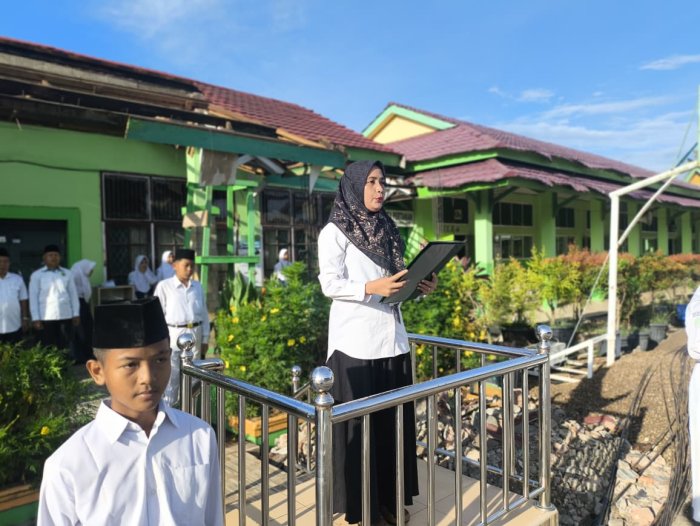 Pembina upacara kali ini adalah Ibu Suryani Hasibuan, guru IPA yang dikenal tegas dan inspiratif. Dalam amanatnya, beliau menekankan pentingnya membiasakan tiga kata ajaib dalam kehidupan sehari-hari: “tolong”, “maaf”, dan “terima kasih”. Menurut beliau, kata-kata sederhana ini mampu menciptakan suasana yang lebih harmonis di lingkungan madrasah.