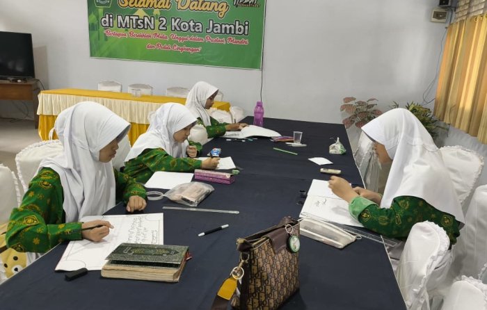 Kota Jambi (MTsN 2) - MTsN 2 Kota Jambi terus melakukan persiapan menjelang pelaksanaan Ajang Kompetisi Seni dan Olahraga Madrasah (AKSIOMA) MTs se-Kota Jambi ke-2. Salah satu kegiatan yang digelar adalah seleksi kaligrafi, yang berlangsung di ruang serba guna madrasah dengan bimbingan guru seni, Pitriati, S.Pd, M.Pd.