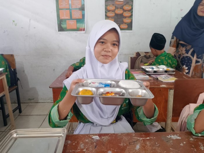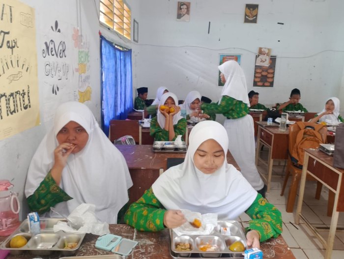 Syarifah, salah satu siswi kelas 7B, mengaku sangat menikmati momen MBG bersama teman-teman. Ia merasa bahwa makan bersama di kelas membuat suasana belajar lebih akrab dan menyenangkan. “Ayam gorengnya enak banget, jeruknya segar, dan susu UHT-nya bikin tambah semangat. Rasanya kayak istirahat yang bikin hati adem,” tuturnya sambil tersenyum.