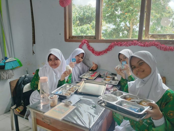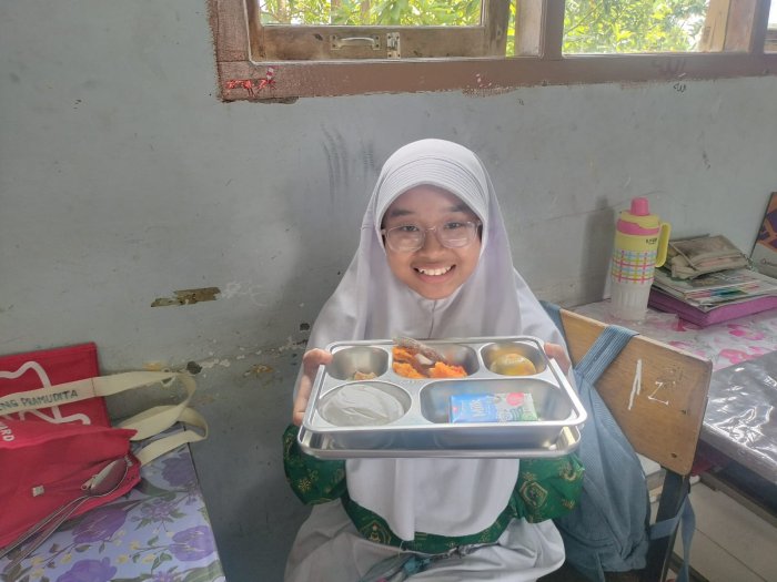 Camisha, salah satu siswi kelas 7E, mengaku sangat menikmati momen MBG bersama teman-teman. Ia merasa bahwa makan bersama di kelas membuat suasana belajar lebih akrab dan menyenangkan. “Ayam gorengnya enak banget, jeruknya segar, dan susu UHT-nya bikin tambah semangat. Rasanya kayak istirahat yang bikin hati adem dan pikiran tenang,” tuturnya sambil tersenyum.