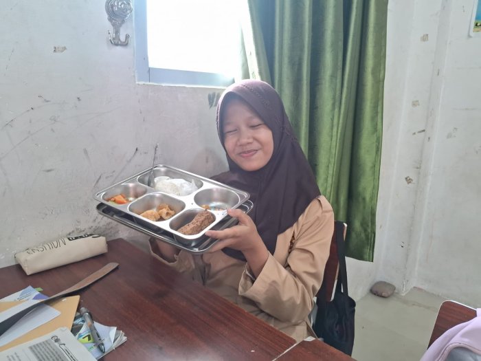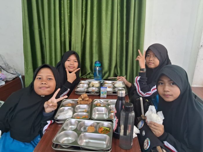 Mika, salah satu siswi kelas 7F, mengaku sangat menikmati momen MBG bersama teman-teman. Ia merasa bahwa makan bersama di kelas membuat suasana belajar lebih akrab dan penuh semangat. “Ayam gorengnya enak banget, jeruknya segar, dan susu UHT-nya bikin tambah semangat. Rasanya kayak recharge sebelum lanjut pelajaran. Aku suka banget suasana MBG di kelas kami,” tuturnya sambil tersenyum.