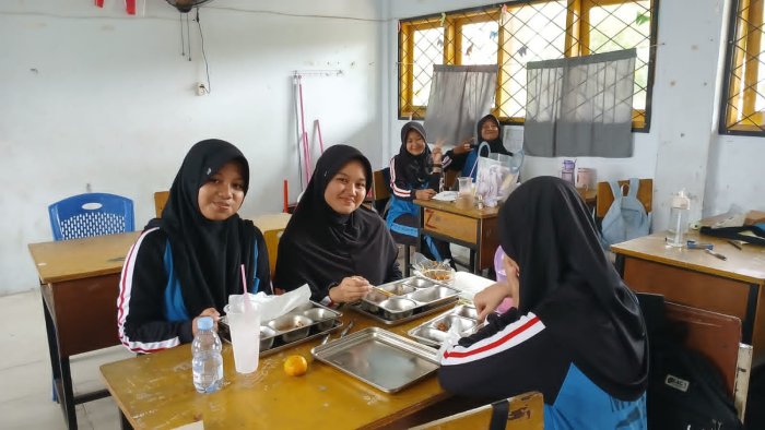 Kota Jambi (MTsN 2 Kota Jambi) — Kegiatan Makan Bergizi Gratis (MBG) di kelas 9F hari ini berlangsung dengan suasana yang tertib dan penuh semangat. Setelah istirahat pertama, siswa duduk rapi, makanan dibagikan, dan aroma ayam masak saus langsung memenuhi ruangan. MBG bukan hanya soal makan, tapi juga tentang menciptakan momen kebersamaan yang menyegarkan di tengah rutinitas belajar.