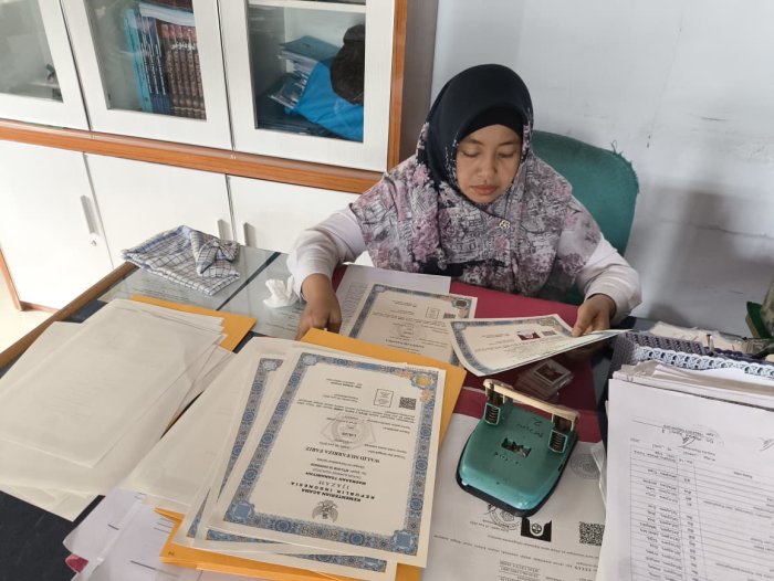 Ibu Mujinah, yang bertugas di bagian pengarsipan, menyampaikan bahwa dokumen ijazah harus disimpan dengan rapi dan aman sebelum dibagikan. “Setelah foto ditempel dan ijazah disusun, kami simpan dalam lemari khusus yang terkunci. Kami juga membuat daftar kontrol agar tidak ada yang tertukar atau hilang. Ini bagian dari tanggung jawab kami sebagai pengelola dokumen madrasah,” jelasnya sambil menunjukkan sistem pengarsipan yang digunakan.