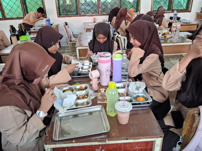Di kelas 8J, suasana tak kalah hangat. Siswa tampak antusias menyambut makanan yang dibagikan. Beberapa bahkan menyiapkan tempat makan sendiri dari rumah sebagai bentuk kesadaran akan kebersihan dan kemandirian. MBG menjadi momen yang ditunggu-tunggu setiap pekan oleh siswa kelas 8J.
