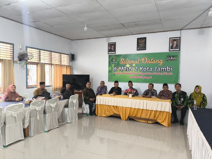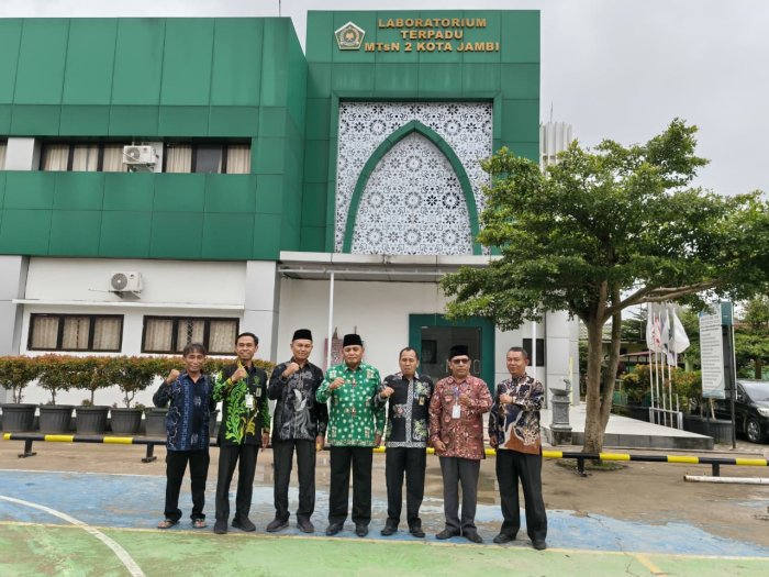 Kota Jambi (MTsN 2 Kota Jambi) — Pelaksanaan Olimpiade Madrasah Indonesia (OMI) tingkat Kota Jambi tahun 2025 mendapat perhatian langsung dari Kantor Kementerian Agama. Hari ini, Kepala Kemenag Kota Jambi bersama tim monitoring dan Kabid Mapenda Kanwil Kemenag Provinsi Jambi melakukan kunjungan ke MTsN 2 Kota Jambi yang menjadi tuan rumah kegiatan. Monitoring ini bertujuan memastikan pelaksanaan OMI berjalan sesuai prosedur, tertib, dan bermutu.