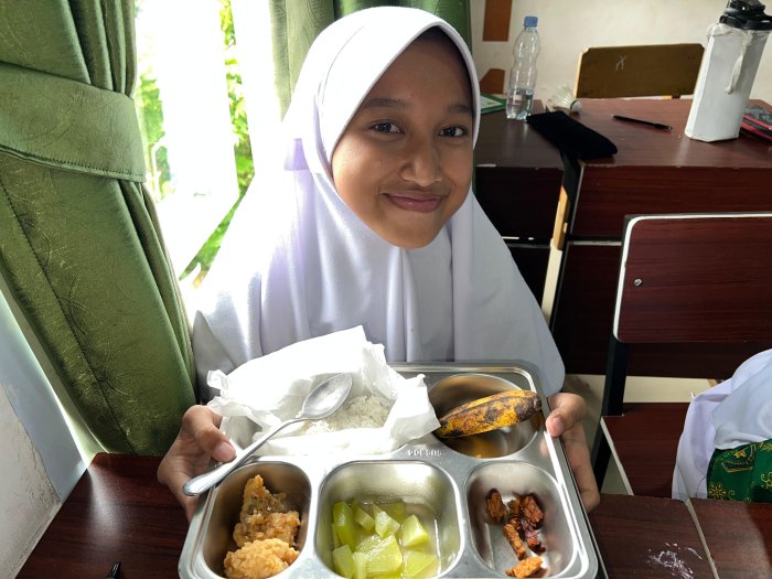 Kelas 7K terlihat sangat antusias, terutama karena ini merupakan pengalaman MBG pertama mereka sebagai siswa baru. Beberapa siswa bahkan membawa tempat makan sendiri dari rumah sebagai bentuk kesadaran akan kebersihan dan kemandirian. Kelas 8K menunjukkan kekompakan dengan saling berbagi lauk dan bercanda ringan, sementara kelas 9K tampil sebagai teladan dengan membantu guru dan adik kelas dalam proses pembagian makanan.