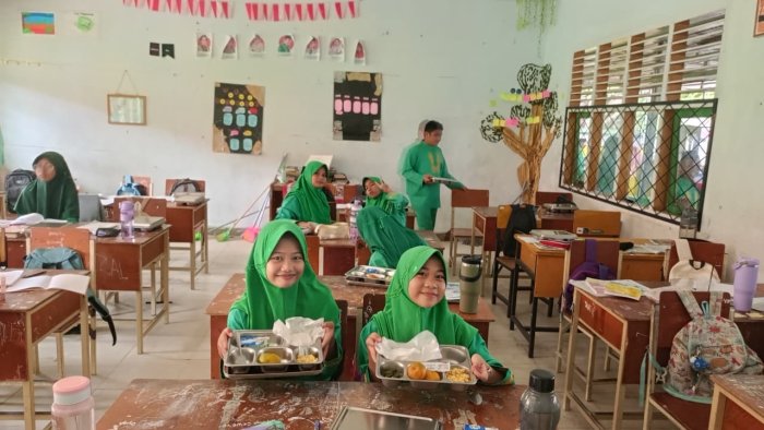 Program MBG juga menjadi ruang pembiasaan hidup bersih dan mandiri. Setelah makan, siswa membersihkan meja, merapikan ruang kelas, dan membuang sampah pada tempatnya. Kegiatan ini memperkuat nilai tanggung jawab dan kepedulian lingkungan yang terus ditanamkan oleh madrasah.