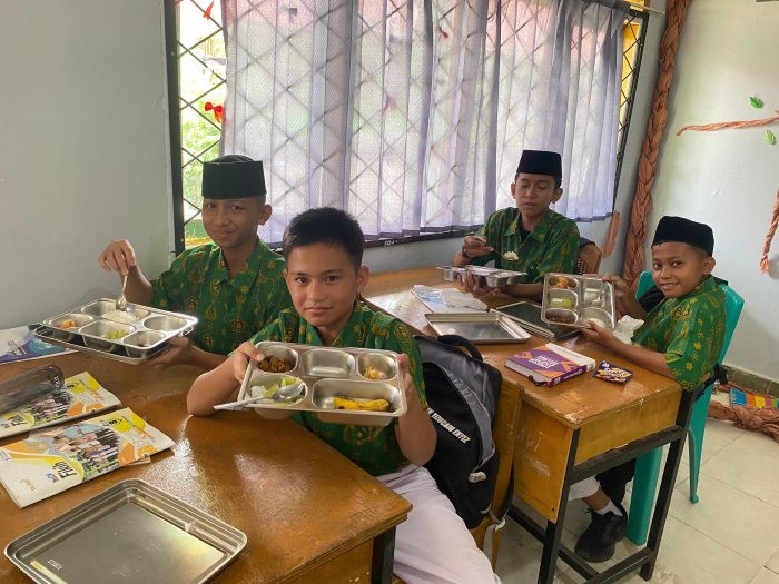 Siswa menikmati makanan dengan tertib dan penuh semangat. Beberapa bahkan berkomentar tentang rasa sayur yang segar dan susu UHT yang menyegarkan. Momen makan bersama ini menjadi jeda yang menyenangkan di tengah rutinitas belajar, sekaligus pengingat bahwa tubuh sehat adalah modal utama untuk berpikir cerdas.