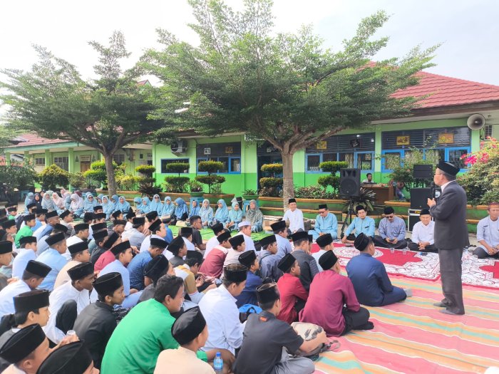 Rangkaian acara dimulai dengan pembacaan ayat suci Al-Qur’an, dilanjutkan dengan shalawat bersama yang menggema di seluruh lapangan. Suasana menjadi haru dan penuh kekhusyukan saat tausiyah disampaikan, mengangkat tema keteladanan akhlak Rasulullah dalam kehidupan sehari-hari. Para siswa mendengarkan dengan penuh perhatian, menyerap nilai-nilai yang disampaikan dengan hati terbuka.