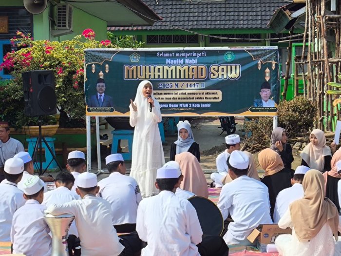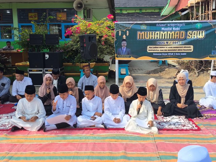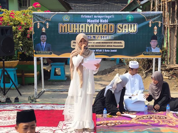 Kota Jambi (MTsN 2 Kota Jambi) — Peringatan Maulid Nabi Muhammad SAW di MTsN 2 Kota Jambi pagi tadi tidak hanya berlangsung khidmat, tetapi juga penuh warna dan ekspresi. Sejumlah penampilan dari siswa—yang akrab disebut masanders—mengisi rangkaian acara dengan nuansa seni dan spiritual yang menyentuh hati. Mulai dari pembacaan sari tilawah, lantunan Asmaul Husna, puisi religi, hingga ceramah singkat tentang sosok Uwais Al Qorni, semua menunjukkan betapa kreatif dan berbakatnya siswa madrasah dalam bidang seni dan agama.