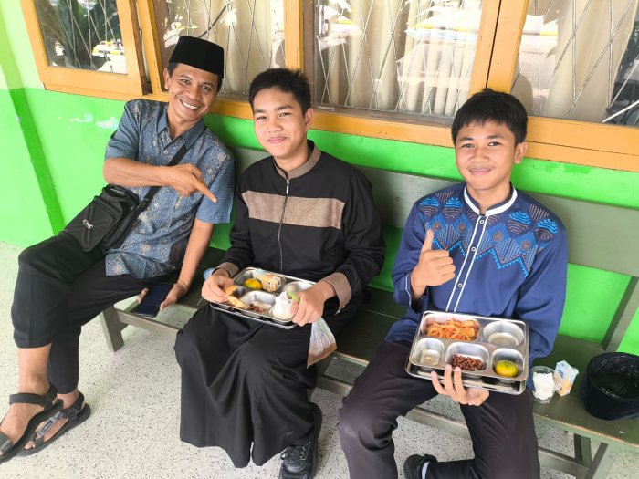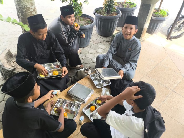 Kota Jambi (MTsN 2 Kota Jambi) — Setelah mengikuti peringatan Maulid Nabi Muhammad SAW yang berlangsung khidmat dan meriah, seluruh masanders dari berbagai jenjang menikmati kegiatan Makan Bergizi Gratis (MBG) yang hari ini dilaksanakan di luar kelas. Suasana lapangan madrasah berubah menjadi ruang makan terbuka yang penuh keakraban dan semangat kebersamaan.