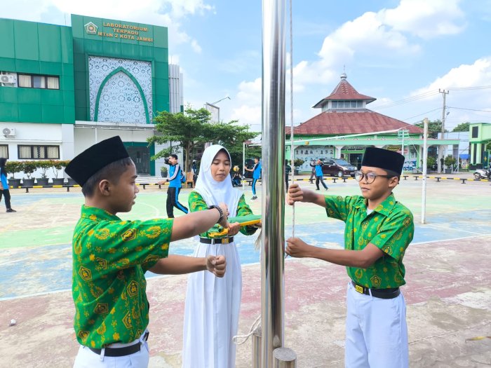Kota Jambi (MTsN 2 Kota Jambi) — Menjelang pelaksanaan upacara bendera hari Senin, kelas 9C MTsN 2 Kota Jambi melaksanakan latihan khusus sebagai petugas pelaksana. Latihan dipimpin langsung oleh wali kelas, Ibu Silmiyah, yang dengan penuh kesabaran dan ketegasan membimbing siswa agar tampil tertib dan berwibawa. Kegiatan ini dilaksanakan di lapangan madrasah dengan suasana yang serius namun tetap hangat.