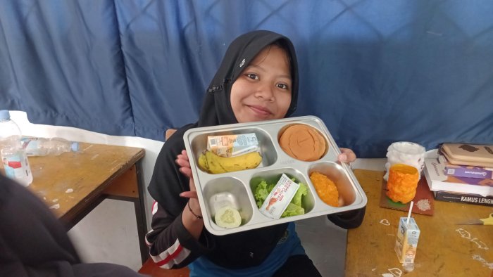 Kegiatan MBG dilaksanakan secara tertib di ruang kelas masing-masing, dengan penataan makanan yang rapi dan higienis. Guru pendamping turut hadir mendampingi siswa, memastikan suasana makan berlangsung nyaman dan penuh kebersamaan. Para siswa menikmati setiap gigitan burger dengan ekspresi senang, menyebutnya sebagai salah satu menu MBG paling favorit sejauh ini.