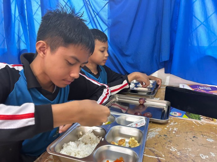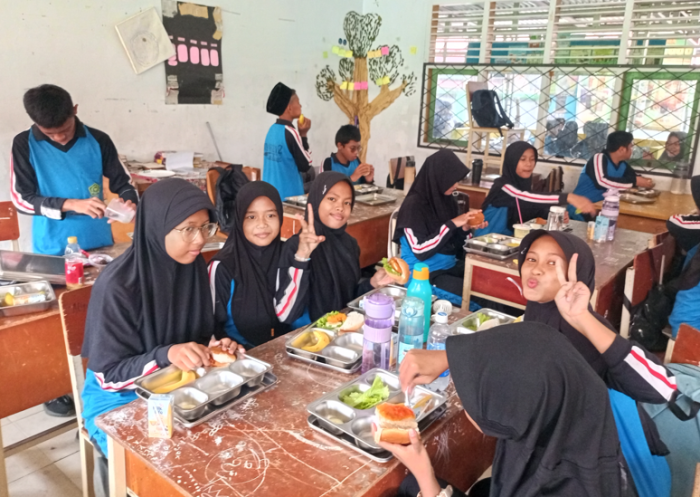 Suasana makan berlangsung tertib dan penuh kebersamaan, dengan guru pendamping turut hadir mendampingi dan memastikan kelancaran kegiatan. Para siswa tampak menikmati setiap suapan, saling berbagi cerita, dan menunjukkan sikap gotong royong dalam membersihkan kelas setelah makan. Kegiatan ini tidak hanya memenuhi kebutuhan gizi, tetapi juga memperkuat nilai-nilai karakter seperti disiplin dan rasa syukur.