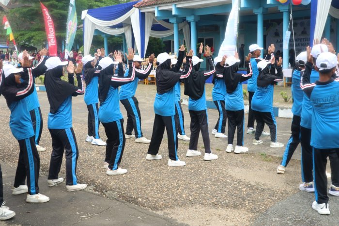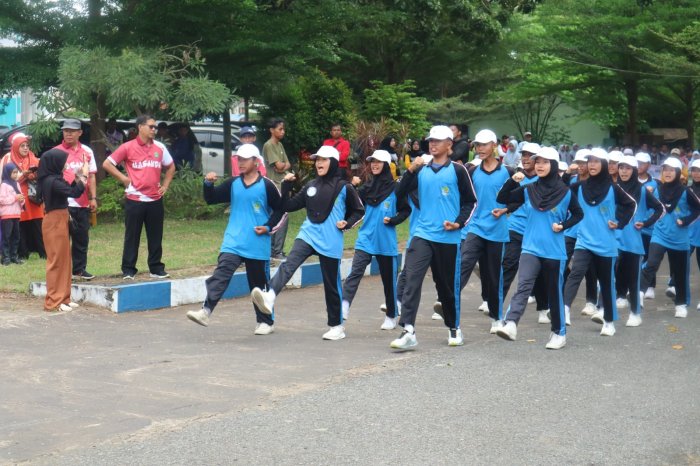 Tak kalah memukau, tim pramuka tampil dengan variasi gerakan baris-berbaris yang inovatif dan penuh kejutan. Mengenakan seragam olahraga dengan topi dan sepatu putih, mereka menunjukkan formasi yang tertib, kreatif, dan penuh semangat. Gerakan yang ditampilkan berhasil memancing riuh tepuk tangan dari seluruh penonton, menandai keberhasilan mereka dalam menyampaikan pesan disiplin dan kebersamaan melalui seni barisan.
