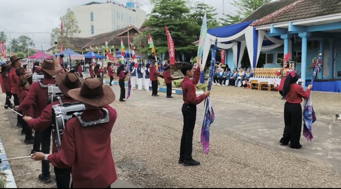 Tim drumband tampil energik membawakan lagu �Serampang Laut� yang dipadukan dengan variasi gerakan �Pacu Jalur� � sebuah gaya barisan yang sedang viral dan menjadi simbol semangat budaya lokal yang dinamis. Kostum topi koboy, atasan merah maroon, dan bawahan hitam semakin memperkuat karakter penampilan yang penuh gaya dan percaya diri. Gerakan barisan yang rapi dan irama pukulan yang kuat membuat suasana podium bergemuruh oleh tepuk tangan penonton.
