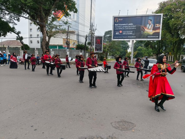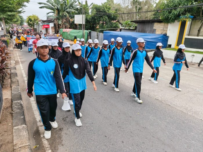 Tim drumband tampil mencolok dengan kostum khas: topi koboy, atasan merah maroon, dan bawahan hitam yang serasi. Irama pukulan dan gerakan barisan yang dinamis berhasil mencuri perhatian peserta dan penonton sepanjang rute pawai. Sementara itu, tim pramuka tampil rapi dan energik dengan seragam olahraga, topi, dan sepatu putih, menunjukkan disiplin dan semangat khas kepramukaan.