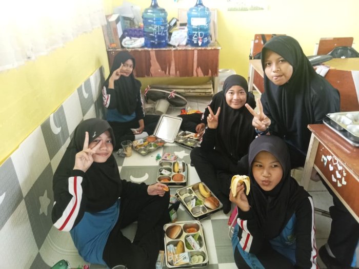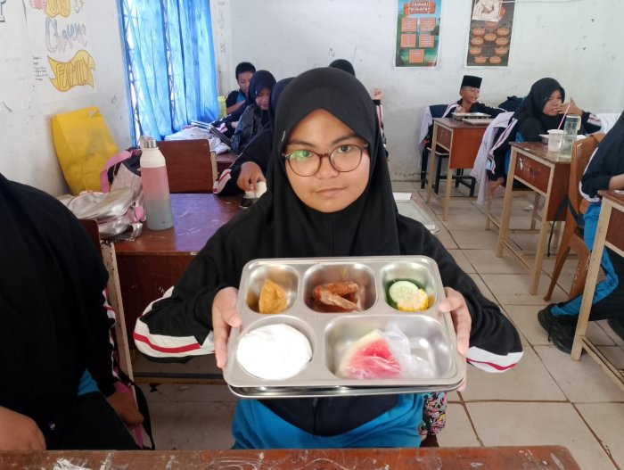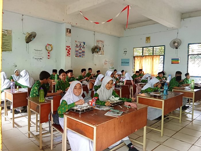 Kota Jambi (MTsN 2 Kota Jambi) — Bagi siswa kelas 7A, 7B, 7C, dan 7D MTsN 2 Kota Jambi, dua hari terakhir bukan sekadar waktu belajar, tapi juga momen mencicipi kebahagiaan sederhana lewat program Makan Bergizi Gratis (MBG). Kamis lalu, mereka disambut dengan semangkuk mie ayam hangat yang menggoda selera, lengkap dengan potongan ayam dan sayuran, serta buah anggur segar sebagai penutup. Menu ini langsung jadi bahan cerita di antara teman-teman, bahkan beberapa siswa menyebutnya “mie ayam rasa madrasah.”