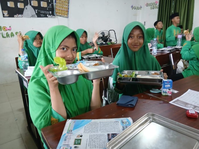 Kota Jambi (MTsN 2) - Suasana makan bersama gizi (MBG) di MTsN 2 Kota Jambi pada Jumat (26/9/2025) tampak hidup dengan semangat dan senyum ceria siswa. MBG kali ini terasa berbeda karena menu yang disajikan untuk siswa adalah ala sandwich, menggantikan menu dengan nasi. Para siswa kelas 7I, 9D, dan 9E menikmati roti tawar dengan ayam dan daun selada segar, yang dipadukan dengan buah kelengkeng manis sebagai pencuci mulut dan susu kotak sebagai minuman sehat.