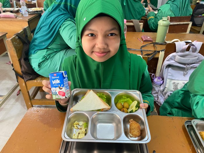 Pada pelaksanaan MBG kali ini, menu yang disajikan dengan roti tanpa nasi. Terdidri dari roti tawar, ayam, daun selada, dan irisan timun segar. Untuk melengkapi asupan gizi para siswa, menu ini juga dilengkapi dengan buah kelengkeng dan susu kotak sebagai minuman pendamping. Pilihan menu ini bertujuan untuk memberikan variasi makanan sehat sekaligus memenuhi kebutuhan nutrisi siswa.