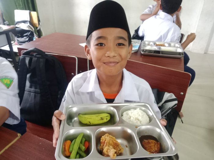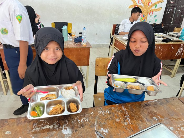 Kota Jambi (MTsN 2) - Kegiatan Makan Bergizi Gratis (MBG) kembali dilaksanakan Senin (29/9/2025) di MTsN 2 Kota Jambi dengan penuh semangat dan antusiasme dari para siswa. Menu MBG hari ini terdiri dari nasi putih, ayam goreng tepung, tumis buncis dan wortel segar, semur tahu, serta buah pisang sebagai penutup. Menu tersebut dirancang untuk memberikan asupan gizi yang seimbang dan memenuhi kebutuhan energi para siswa selama beraktivitas di sekolah.