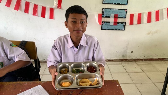 Program MBG kali ini menyajikan menu makanan yang beragam dan bergizi. Para siswa menikmati kentang goreng renyah, telur bulat dengan saus gurih, tumis sawi hijau yang segar, kacang goreng sebagai sumber protein tambahan, serta buah kelengkeng manis sebagai penutup. Menu tersebut dirancang untuk memenuhi kebutuhan gizi harian siswa dan memberikan energi untuk beraktivitas di sekolah.